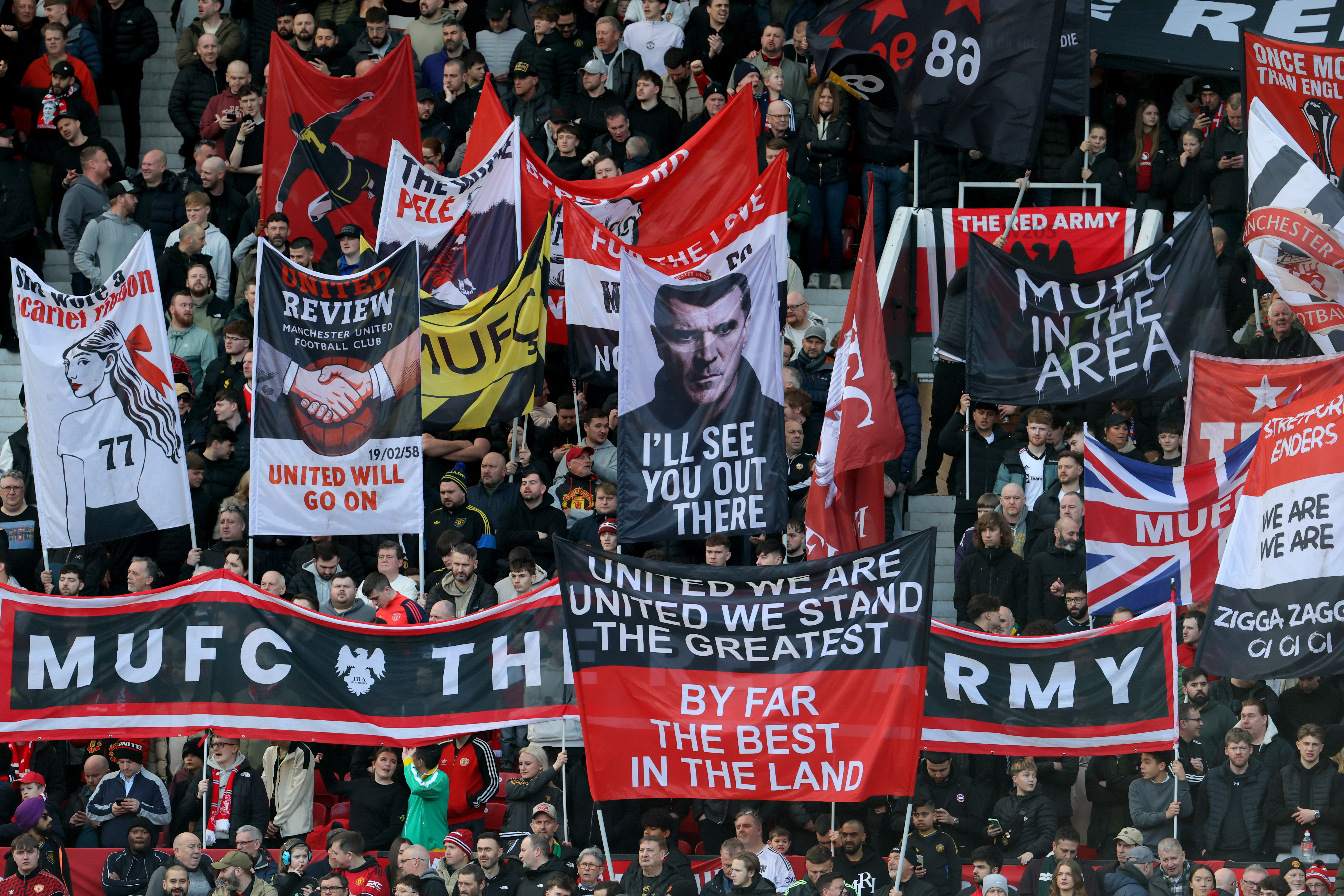 وعرض مشجعو مانشستر يونايتد صورا للاعبين أجانب تعشقهم الجماهير من الماضي والحاضر، بما في ذلك الفرنسيين إيريك كانتونا وباتريس إيفرا ولاعب الوسط الكوري الجنوبي بارك جي-سونج والنرويجي أولي جونار سولشار والقائد الحالي برونو فرنانديز والبرازيلي كاسيميرو وأماد ديالو من ساحل العاج.