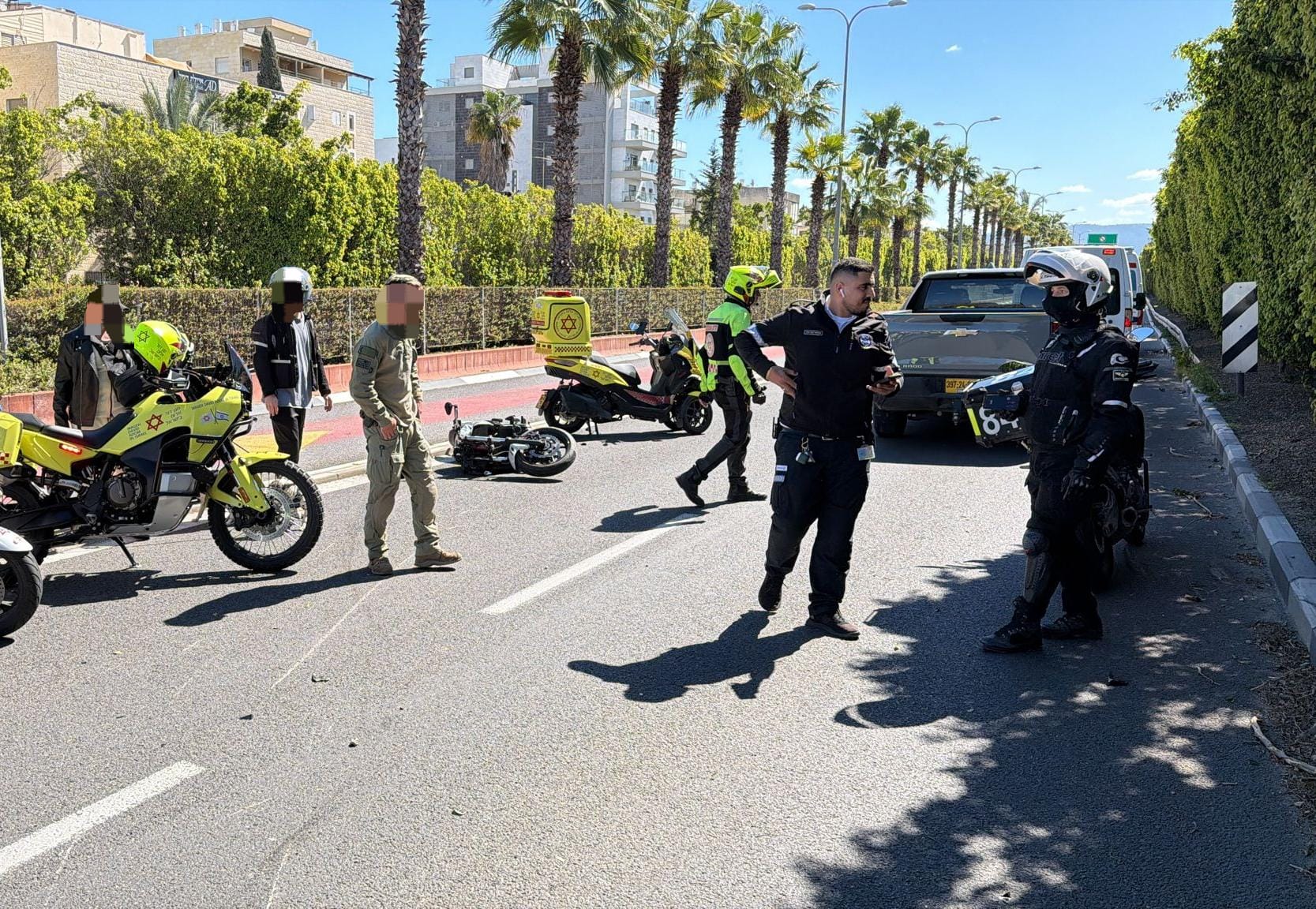 وقال المسعفون من وحدة الدراجات النارية في نجمة داود الحمراء، غال ستافسكي، ويوعاد عامر، ونتان شاحر: "كان المصاب ملقى في وسط الطريق إلى جانب دراجته النارية، وهو في حالة تشوش بالوعي بعد أن تعرض لحادث سير وقع خلال صفارة الإنذار. قدمنا له علاجا طبيا منقذا للحياة، ثم نقلناه إلى المستشفى بينما كانت حالته غير مستقرة".