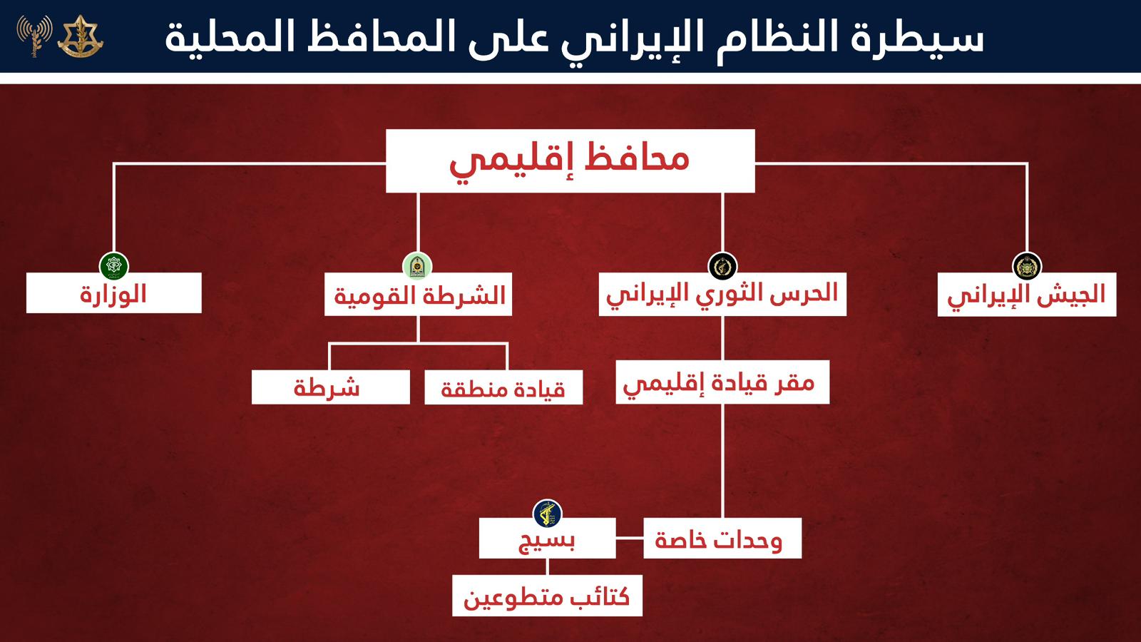 واضاف البيان: " يكشف الجيش الاسرائيلي الآن أنه تم تدمير معظم الممتلكات الرئيسية لقوات الأمن الداخلي والبسيج في هذه المحافظة، ومنها: