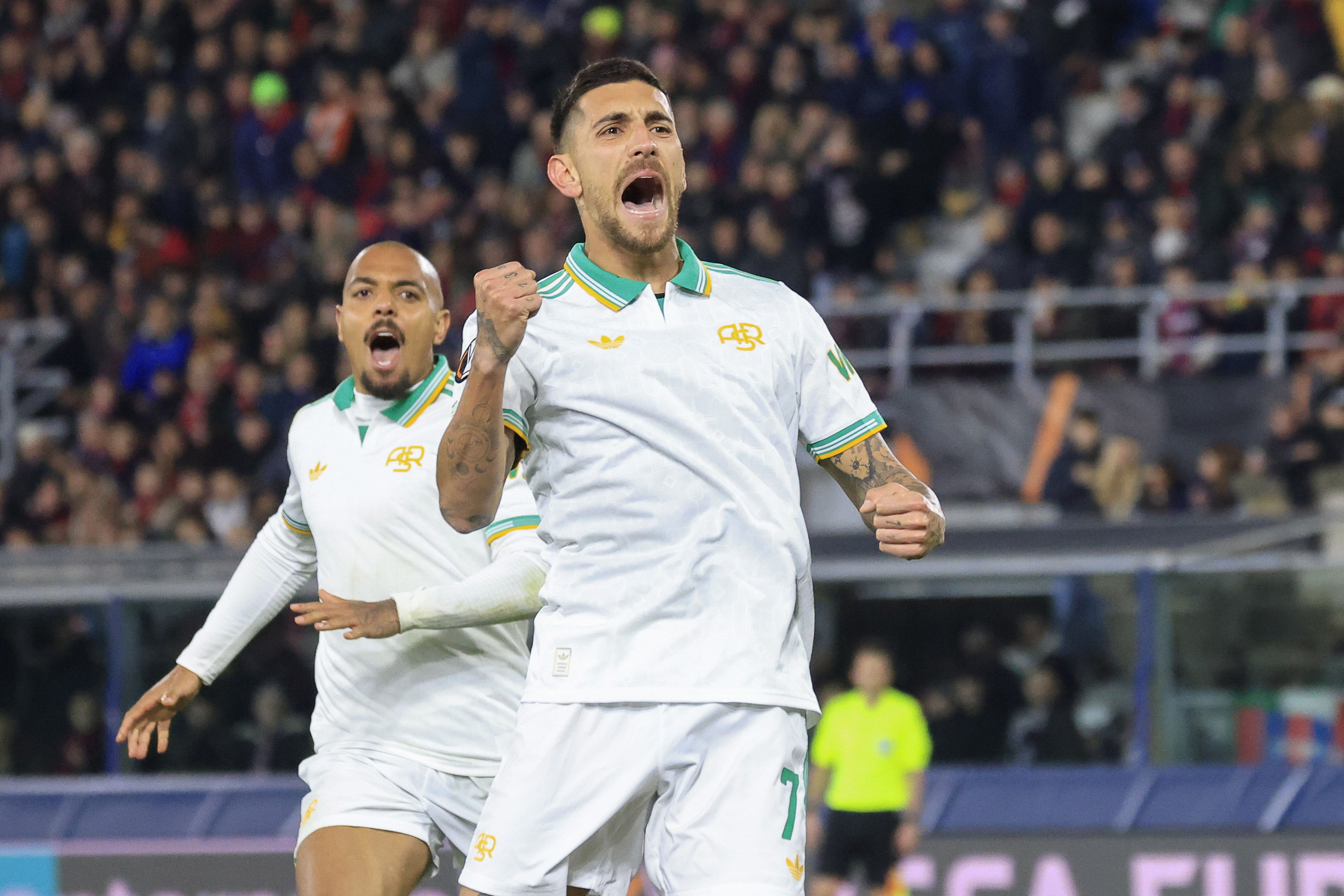 لورينتسو بيليجريني لاعب روما يحتفل بتسجيله الهدف الأول أمام بولونيا في ذهاب دور الستة عشر بالدوري الأوروبي لكرة القدم يوم الخميس - (Photo by Riccardo De Luca/Anadolu via Getty Images)
