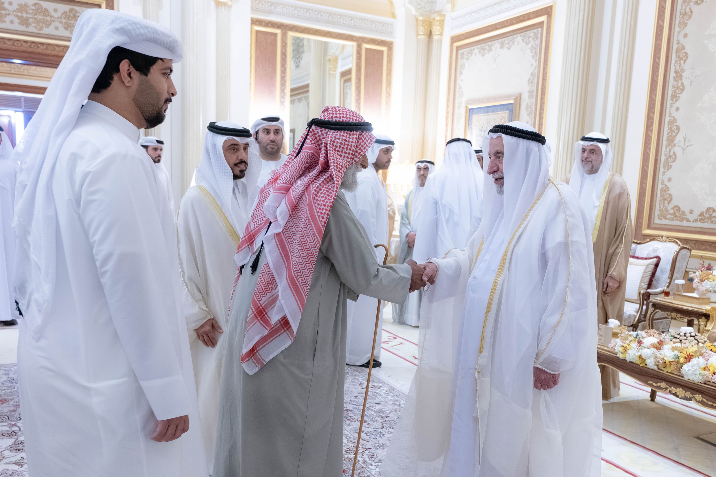 والشيخ عبد الله بن سالم بن سلطان القاسمي، نائب حاكم الشارقة، والشيخ سلطان بن أحمد بن سلطان القاسمي، نائب حاكم الشارقة، استقبال جموع المهنئين الذين قدموا للسلام على حاكم الشارقة بمناسبة حلول عيد الفطر السعيد، وذلك في قصر البديع العامر.