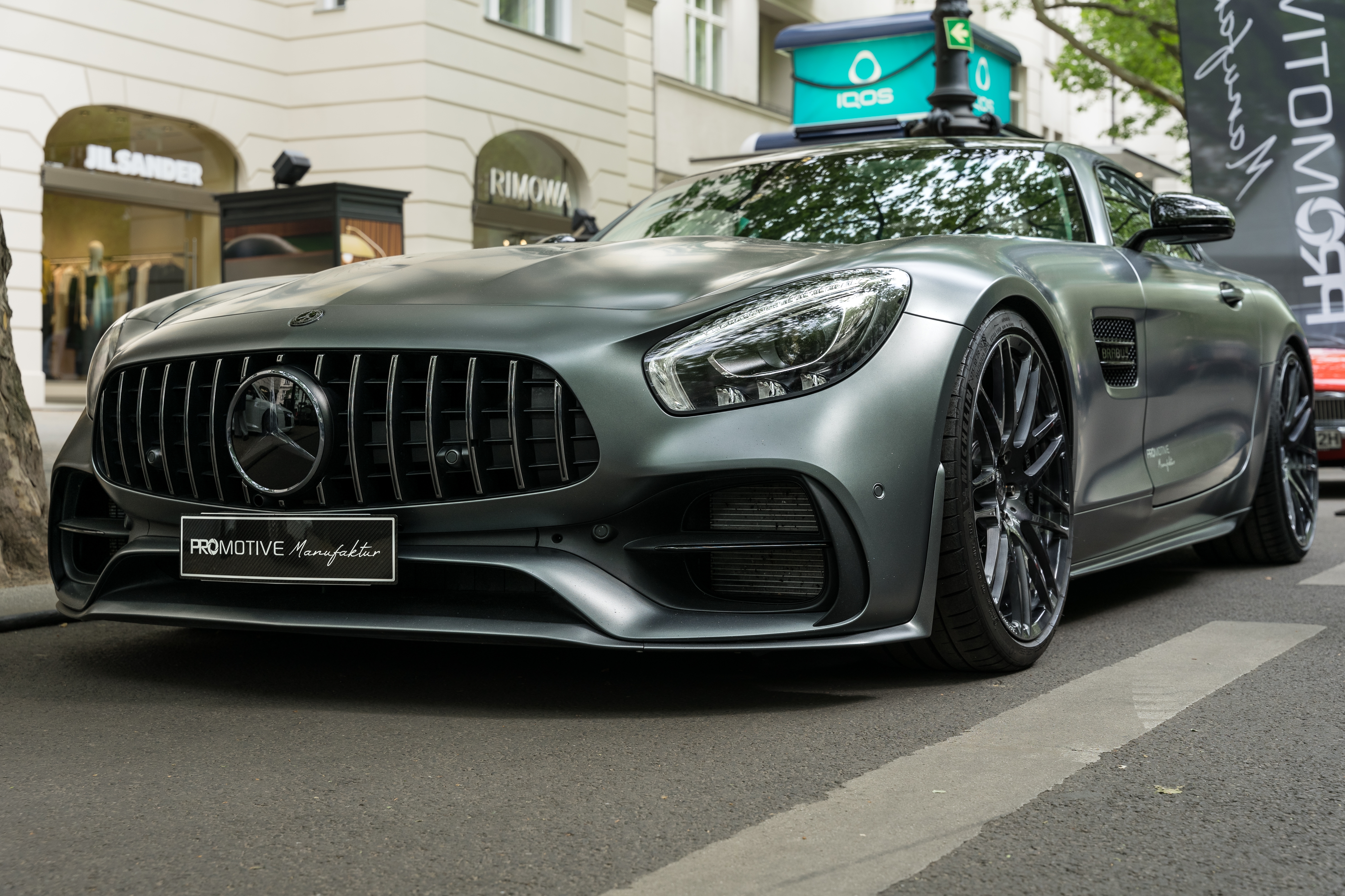 لم تبخل مرسيدس في وضع لمساتها الخاصة؛ فشعار AMG (شجرة التفاح بجانب النهر) يظهر بشكل عملاق على السقف الزجاجي البانورامي، والذي يتميز بخاصية التعتيم الذكي. كما أن الشعار يضيء جنباً إلى جنب مع رسومات تقنية للمحركات (الكامات والصبابات) كنوع من التقدير لإرث الاحتراق الداخلي، رغم أن السيارة لا تمتلك محرك بنزين!