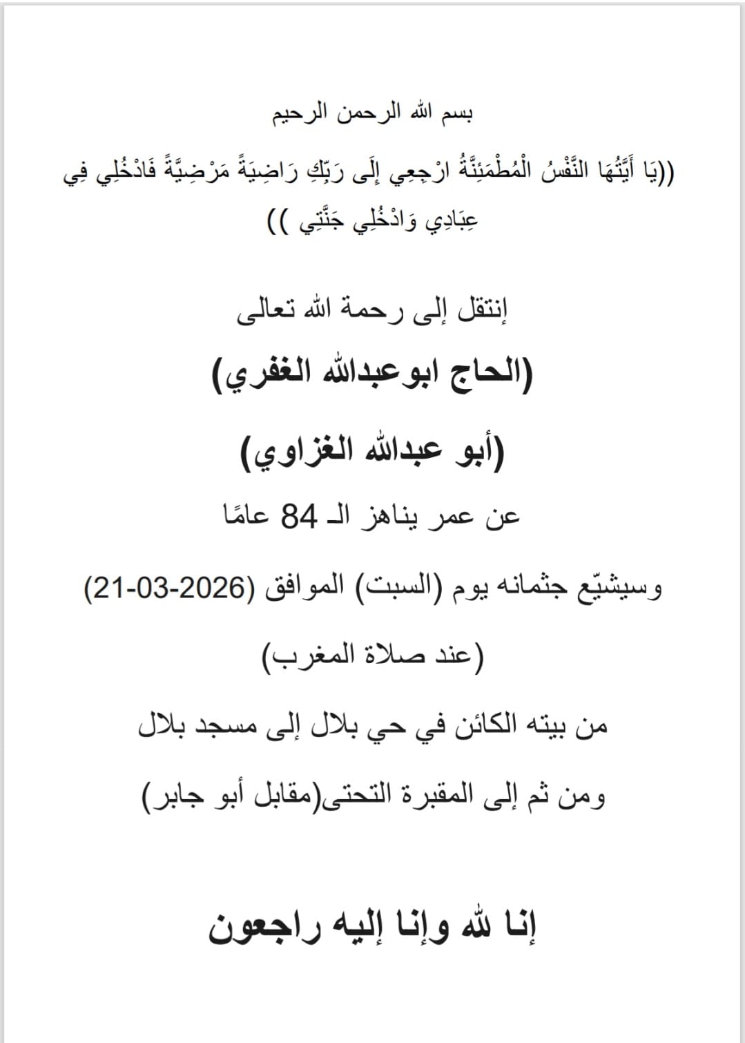 انتقل الى رحمته تعالى الحاج أبو عبدالله الغفري من الناصرة عن عمر ناهز الـ 84 عاما وسيشيع جثمانه اليوم السبت عند صلاة المغرب من بيته الكائن في حي بلال الى مسجد بلال