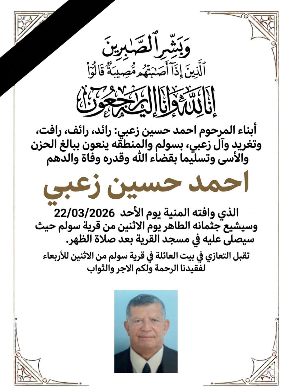 انتقل الى رحمته تعالى أحمد حسين زعبي من سولم وسيشيع جثمانه الطاهر اليوم الاثنين من قرية سولم حيث سيصلى عليه في مسجد القرية بعد صلاة الظهر .